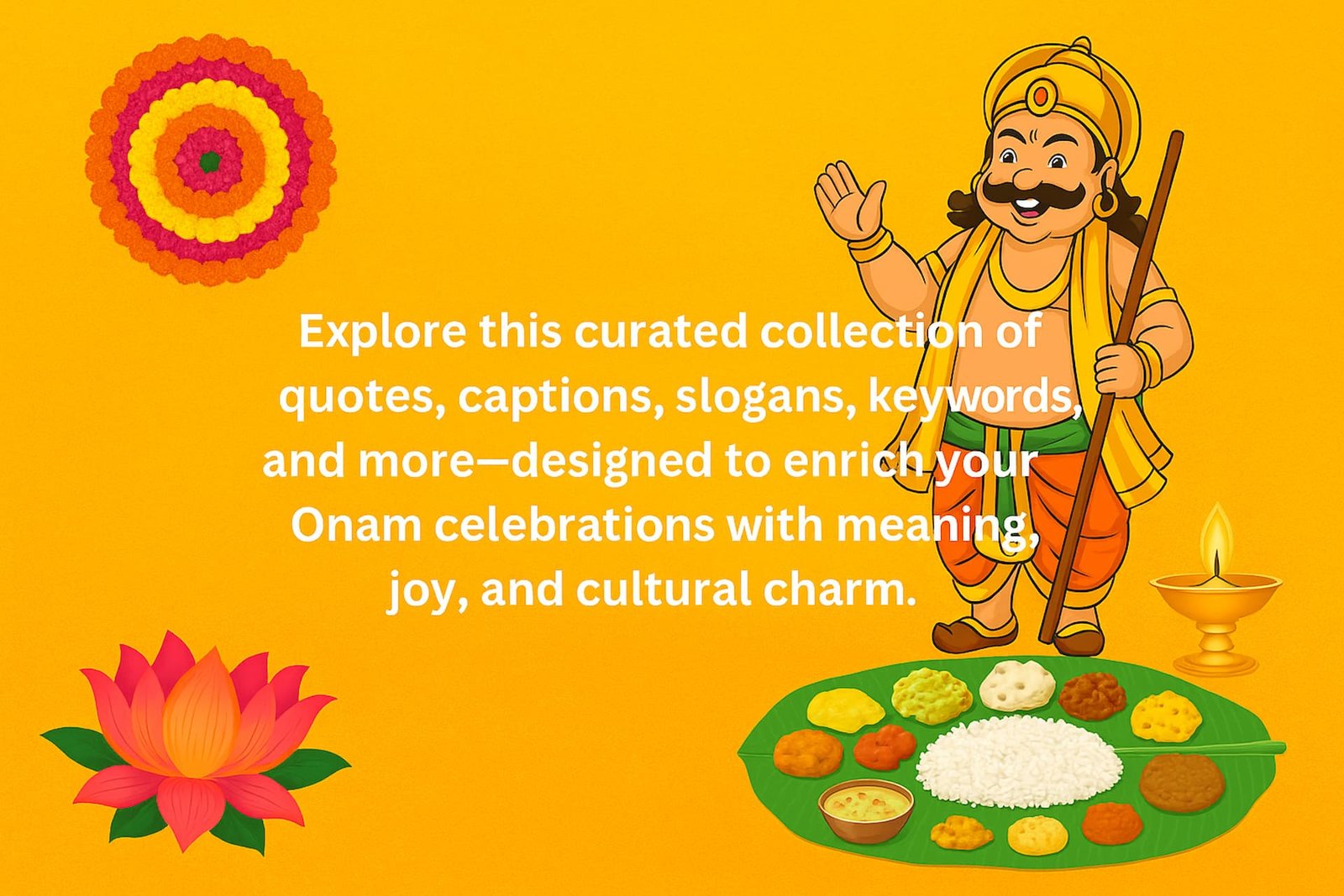 Explore this curated collection of quotes, captions, slogans, keywords, and more—designed to enrich your Onam celebrations with meaning, joy, and cultural charm.